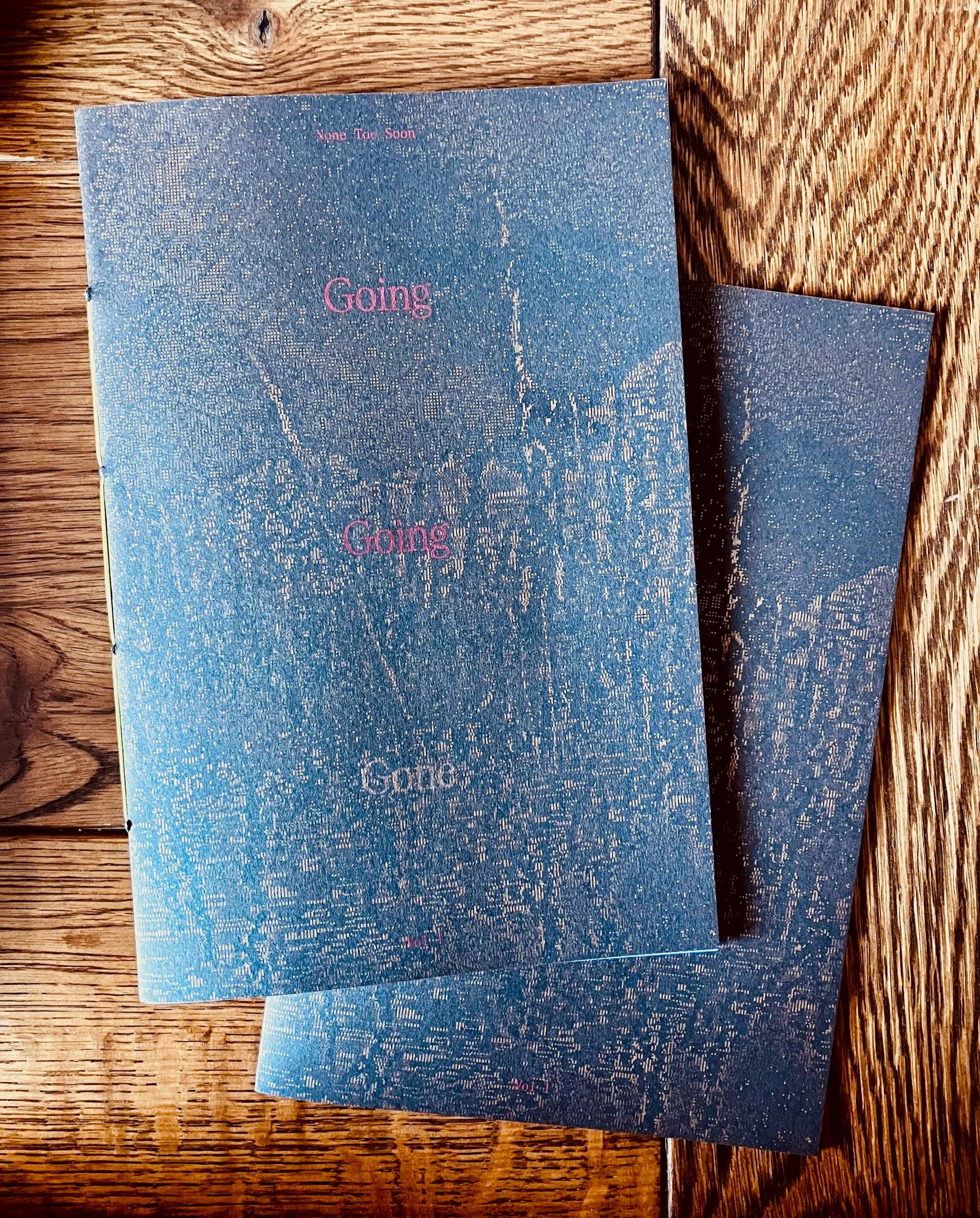 None Too Soon is an ephemeral press fueled by urgency, necessity, and doing the thing together. Our first volume, Going Going, is available now.